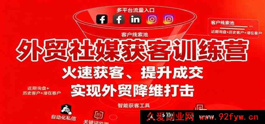 课程内容广泛,囊括社媒账号的全方位搭建与运营技巧,聚焦海外社媒截流来挖掘潜在客户,掌握外贸短视频高效批量获客之法,还有AI社媒矩阵自动化运营的秘籍。同时,设有班级群实时答疑服务,助力你依靠独特方法迅速拓展客源、提高成交率,达成外贸领域的降维竞争优势。