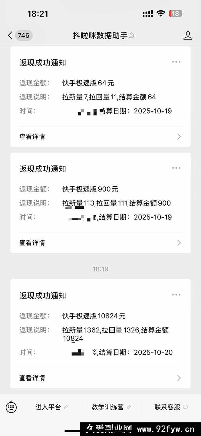 其原理并不复杂,我们所从事的是快手极速版拉新业务。只需在各大平台发布图文或者视频,一旦有转化便会产生收益。发布的素材由我们来提供,还有独家工具供您使用,哪怕是完全的新手,一学就会,只要有手机就能开展操作。前几个月操作抖音极速版推广时也是类似的玩法,引导用户下载极速版,每日打卡就能领取 5000 红包或者苹果 17 手机。这般活动更具吸引力。依照我们的玩法,每天订单不断,一天几千甚至达到五位数收益都属于正常情况。另外,我们对接的是快手官方,次日进行结算。这在拉新业务里结算速度算是极快的了,您可以安心去推广。目前一单大概 12 块左右,咱们先不说多,一天拉 10 单那就是日入三位数,按照我们的方法,也不说日入过万,认真做日入几千都是很平常的事。最为关键的是平台结算快,无需等待,每天结算,次日就能提现~