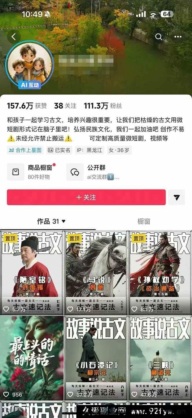 这是一门由拥有110万粉丝的博主亲自传授的AI古文短视频实操课程,它全面且系统地讲授了从文案创作、分镜设计、利用AI绘图(Midjourney)直至视频生成(即梦3.0)、配音把控以及平台运营的整个流程制作诀窍,助力学员掌握故事说古文类内容的完备生产体系,并且能够拓展应用到其他短视频领域。